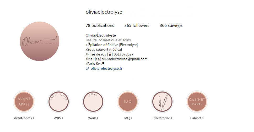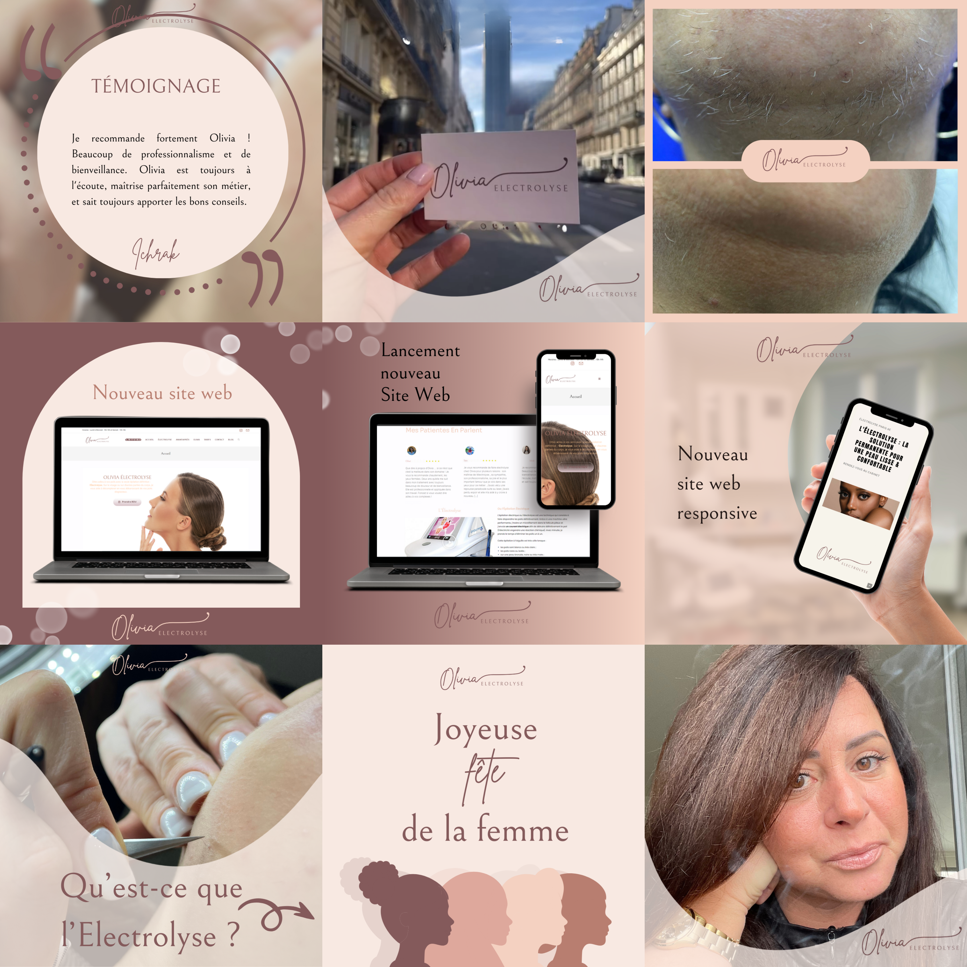 Olivia est Électrolyste et présente uniquement sur Instagram, elle voulait également avoir une présence optimale en ligne. Le choix de la création d’un site internet s’est donc immédiatement imposé, il fallait donc avoir un nouveau logo, une nouvelle charte graphique… Nous avons réalisé le logo, une charte graphique, créé toute une identité visuelle. La cliente dispose désormais d’une stratégie complète à utiliser et à exploiter sur ses réseaux sociaux : identité, des templates prêts à l’emploi, une carte de visite à distribuer à ses clientes, un calendrier éditorial sur plusieurs mois. En plus de la création de contenu (photos et vidéos) dans son cabinet.